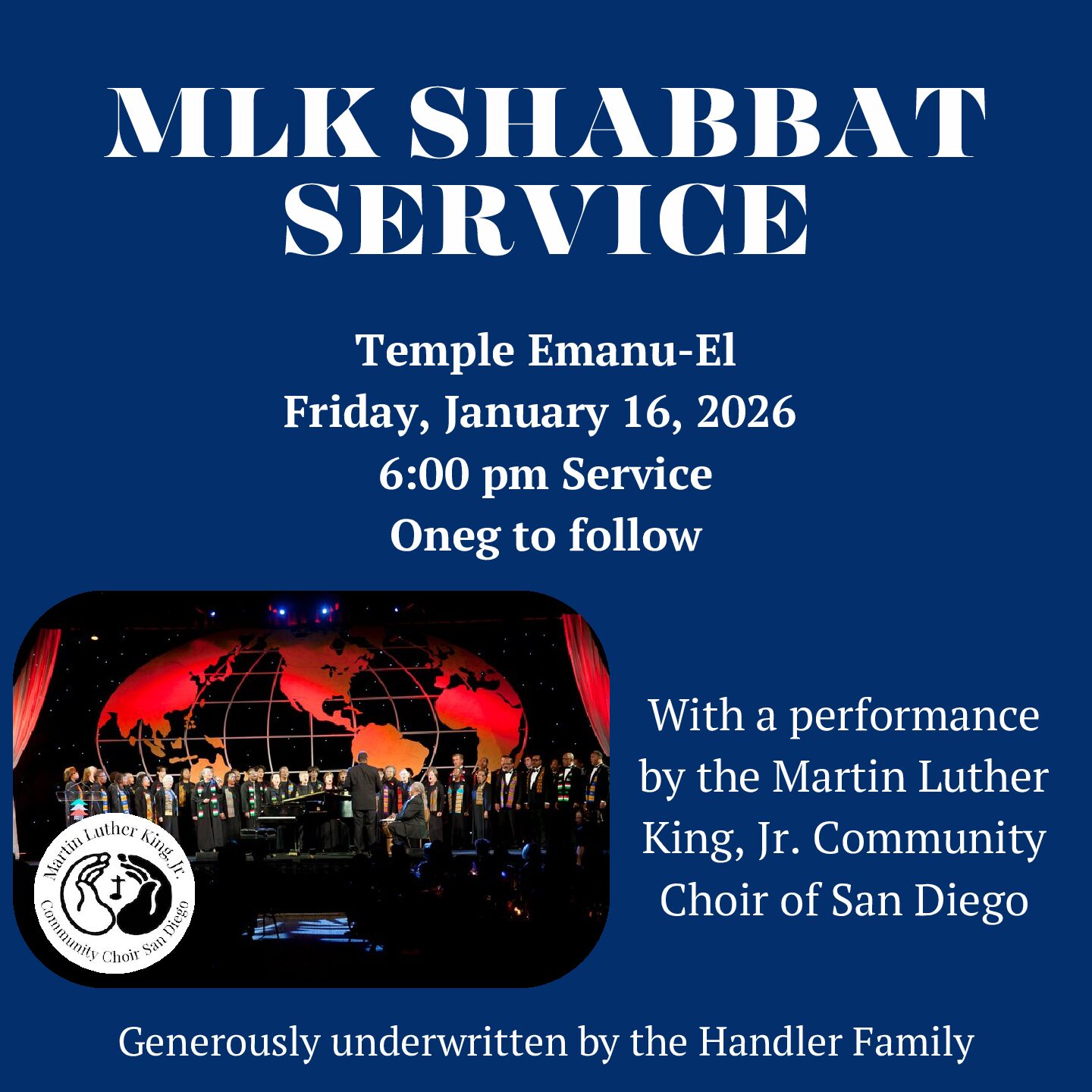 Join us this Friday for a Shabbat Service honoring Martin Luther King, Jr. with a performance by the Martin Luther King, Jr. Community Choir of San Diego. This event is generously underwritten by the Handler Family. |