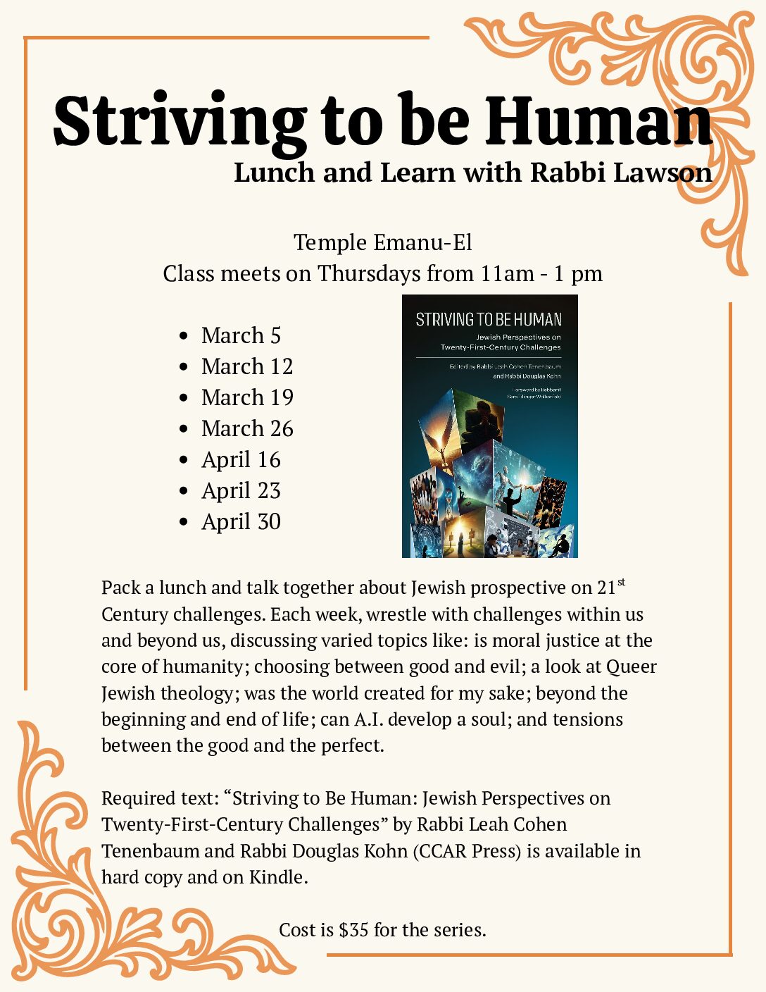 Striving to be Human Lunch and Learn with Rabbi Lawson Temple Emanu-El Class meets on Thursdays from 11:30 am - 1 pm March 5 March 12 March 19 March 26 April 16 April 23 April 30 Pack a lunch and talk together about Jewish prospective on 21st Century challenges. Each week, wrestle with challenges within […]